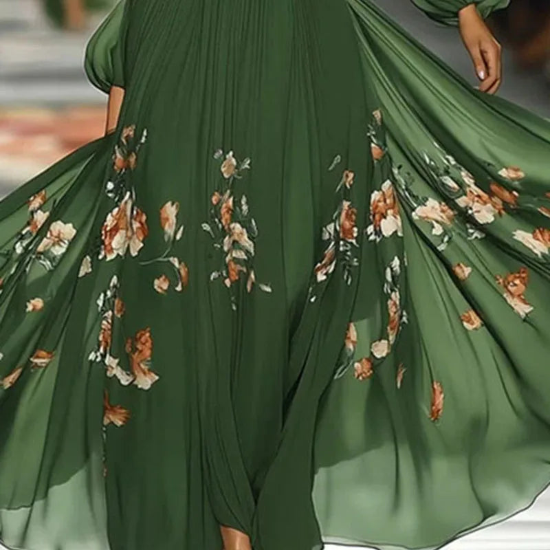 Elevate your wardrobe with this elegant emerald green maxi dress featuring delicate pullover tatting folds that add texture and movement. The floral pattern enhances its sophisticated charm, while the flowing silhouette offers grace and comfort for any occasion. Perfect for making a refined statement, this dress combines timeless style with modern detailing.