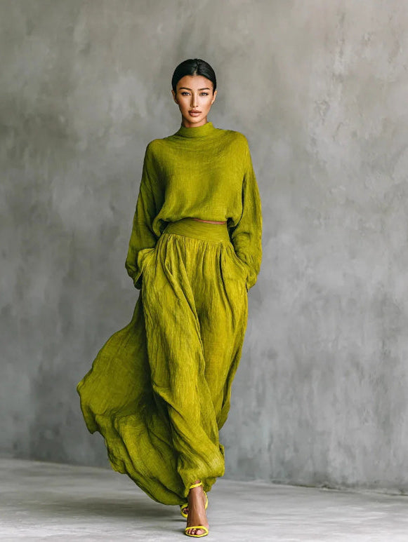 Cozy up in this playful turtleneck top paired with a flowing ankle-length maxi skirt. The loose fit and elastic waist keep you comfortable all day, while the chic silhouette brings effortless style to your look. Perfect for dancing through your day with ease and fun flair!