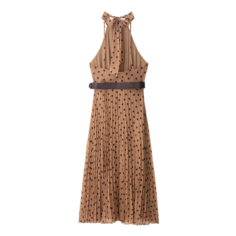 Elevate your wardrobe with this refined polka dot dress, featuring charming mid-calf tatting sashes that add an elegant touch. The pleated silhouette creates graceful movement and dimension, while the non-stretch fabric ensures a structured, polished fit. Perfect for occasions calling for understated sophistication, this piece combines timeless pattern details with contemporary styling for a look that's both distinctive and refined.